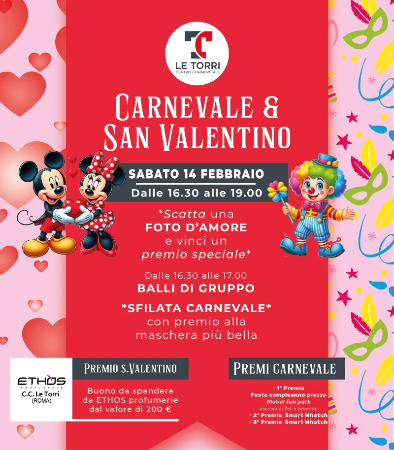 Carnevale e San Valentino al Centro Commerciale Le Torri: ti aspettiamo Sabato 14 Febbraio per due grandi occasioni e con incredibili premi!