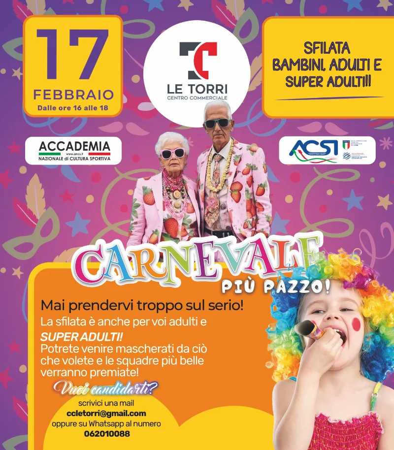 Carnevale più pazzo! al Centro Commerciale Le Torri, martedì 17 Febbraio dalle 16:00 alle 18:00.